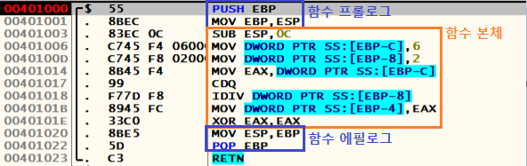 2) Main함수 진입(F7) – 함수 프롤로그, 함수본체, 함수 에필로그 확인