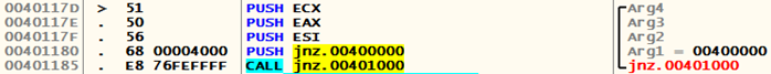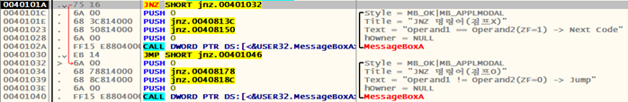 00401034 |. 68 78814000 PUSH jnz.00408178 ; |Title = "JNZ 명령어(점프O)"