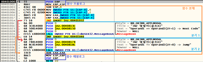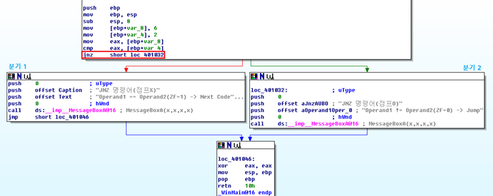 - CMP eax, [ebp-4] 하여 eax - [ebp-4] 의 값이 0인지 확인한 후, JNZ 401032 에 의하여 비교 결과값이 0이 아니면 401032 , 분기 2로 점프하고, 그렇지 않으면 다음 코드, 즉 분기1이 실행되는 것을 볼 수 있다.