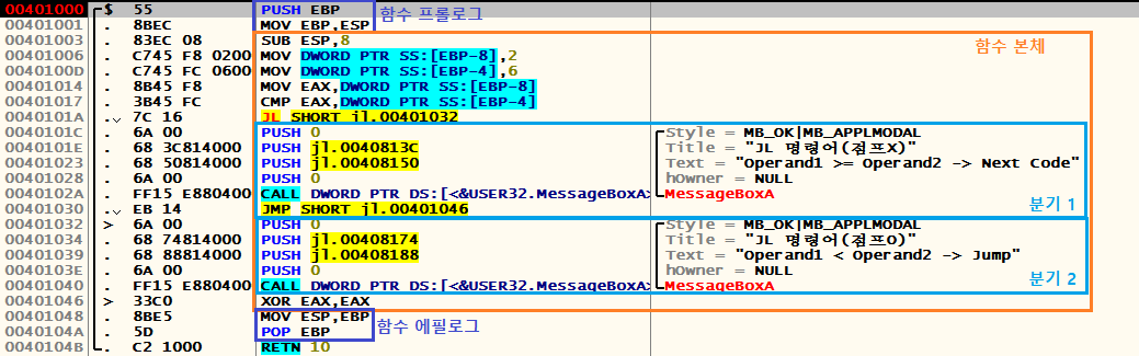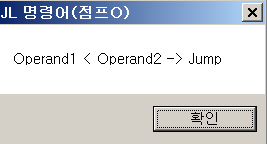 MessageBox(NULL, "Operand1 < Operand2 -> Jump", "JL 명령어(점프O)", MB_OK);