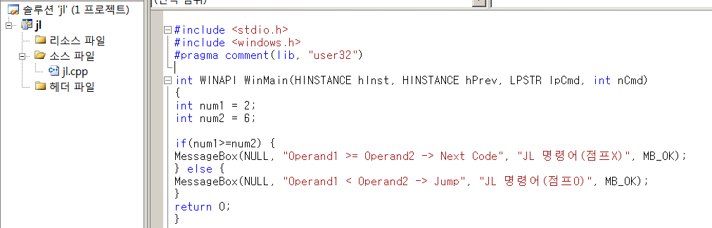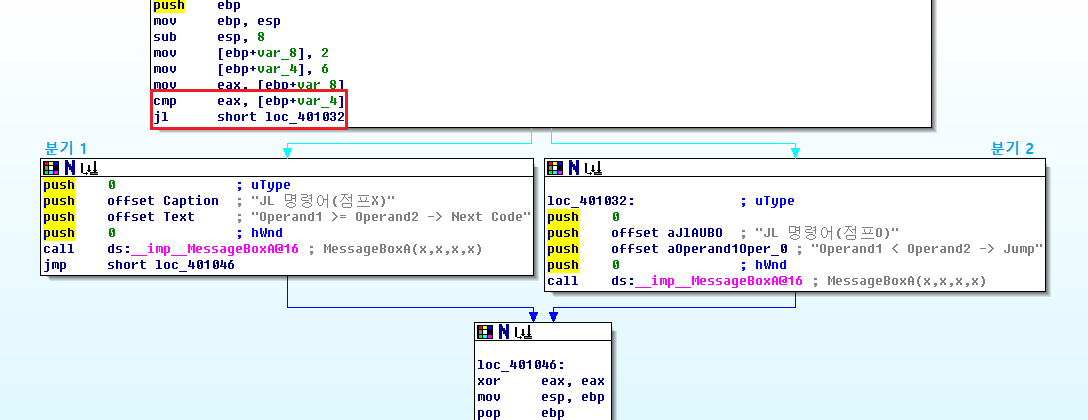 MessageBox(NULL, "Operand1 >= Operand2 -> Next Code", "JL 명령어(점프X)", MB_OK);