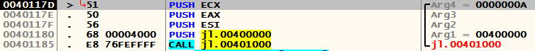 00401034 |. 68 74814000 PUSH jl.00408174 ; |Title = "JL 명령어(점프O)"