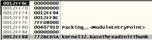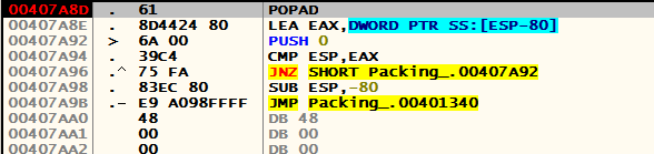 POPAD : 나중에 프로그램 내부에서 언패킹할때 명령어를 이용하여 스택에 저장된 레지스터 값을 복원한다.