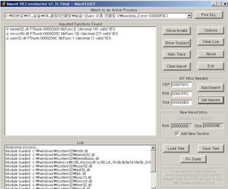 5) ImportREC를 이용하여 덤프된 파일에 IAT 정보를 연결한다.