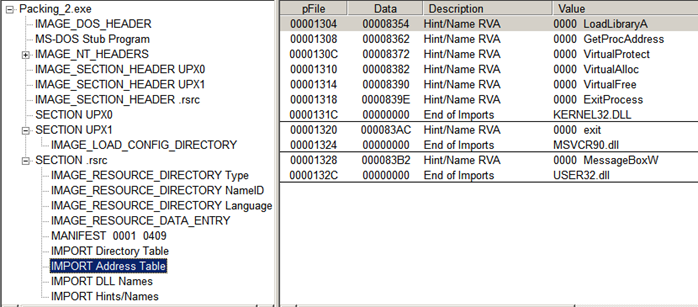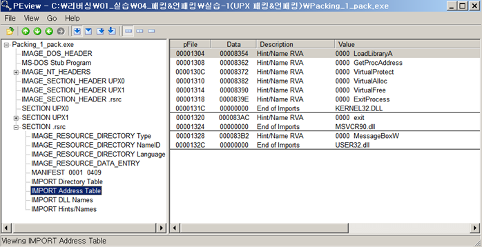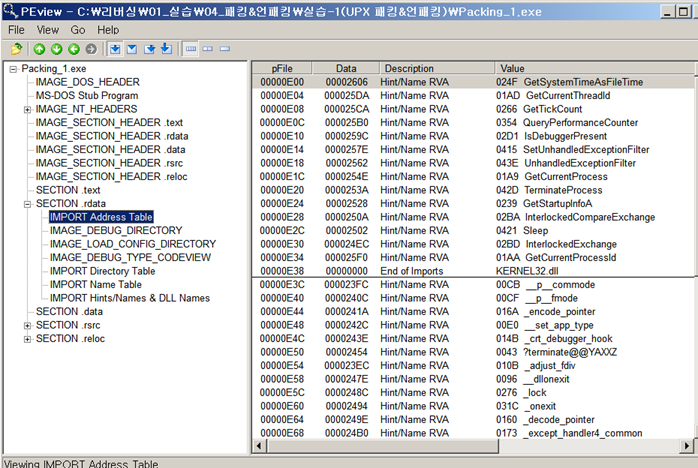 - 원본 파일(Packing_1.exe) -> SECTION .rdata -> IAT (DLL/함수 전체 목록 확인 가능)