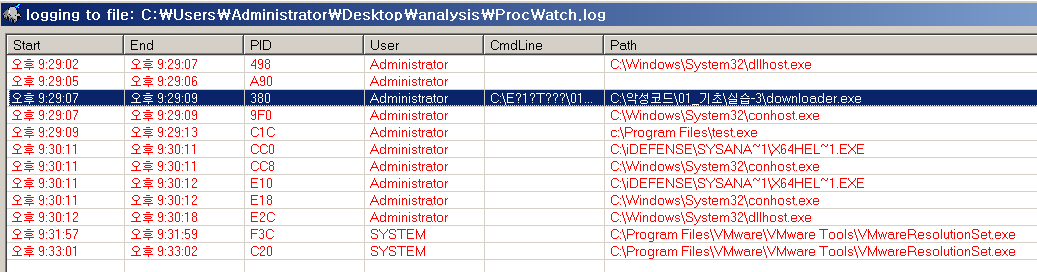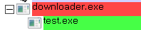 SysAnalyzer 에 downloader.exe파일을 올려놓고 실행하면 , procexp에 downloader.exe 파일이 test.exe파일을 생성하는것을 확인할 수 있다.