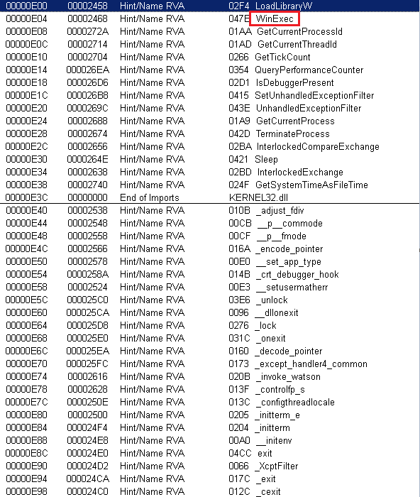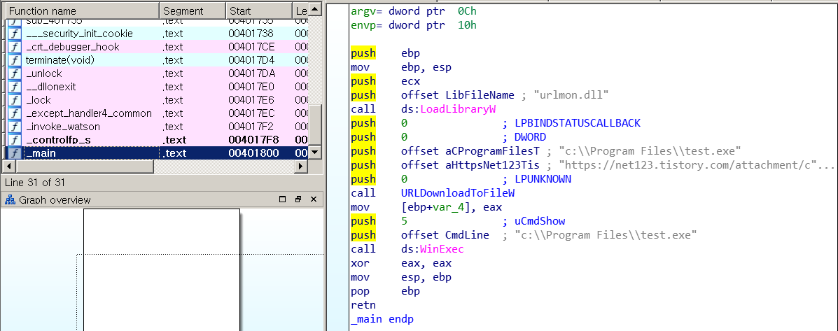 이 중 눈여겨봐야할 함수는 Winexec , URLDownloadtoFileW이다.
