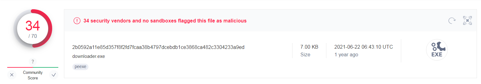 이 파일은 downloader.exe가 해당 URL 에서 다운받아 저장한 실행파일이라고 볼 수 있다.