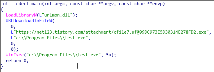 downloader가 해당 url에서 확장자가 .exe 인 실행파일을 다운받아 test라는 이름으로 저장해 winexec를 통해 파일을 실행할것으로 예상된다.