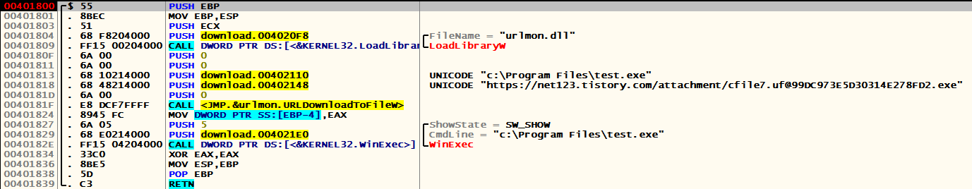 00401818 |. 68 48214000 PUSH download.00402148 ; UNICODE "https://net123.tistory.com/attachment/cfile7.uf@99DC973E5D30314E278FD2.exe"