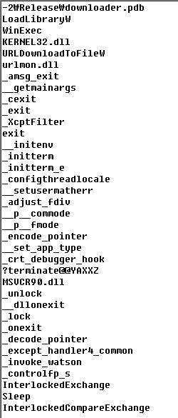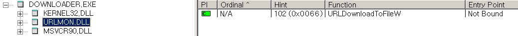 이 문자열을 통해 downloader.exe는 어떠한 파일을 실행시키고, URLDownloadtoFileW를 통해 웹에있는 파일을 다운로드할것이라 예상할 수 있다.