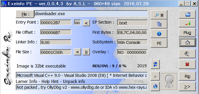exeinfope를 이용해서 downloader.exe파일을 열어본 결과 따로 패킹되지 않은것으로 확인되어 바로 실습을 진행하면 될 것 같다.