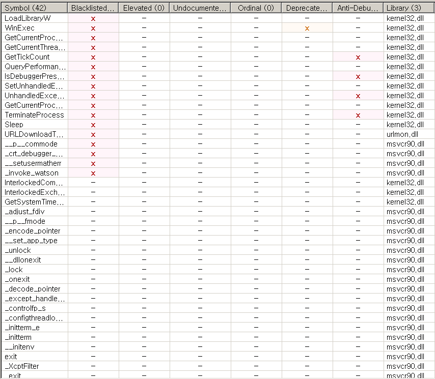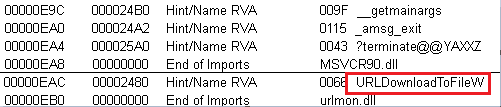 따라서, 새로운 악성코드를 다운로드하기 위해 URLDownloadtoFile 을 사용하고, 실행하기 위해서 ShellExecute , WinExec 등을 호출한다.