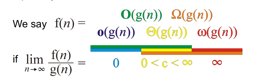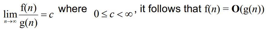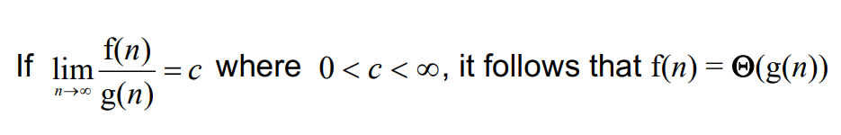 또한, n이 무한히 커졌을 때, f(n) 과 g(n)의 비율은 상수값으로 수렴하게되고, C>=0 이기때문에 둘의 증가속도는 같거나 크다고 볼 수 있다.