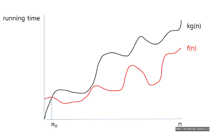 이것은 f(n)의 running time이 최악인 경우에도, 점근상한선인 k*g(n)을 넘을수가 없다는것을 의미한다.
