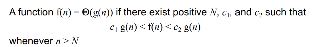 만약 특정 실행시간이 Θ(g(n)) 이라면, 상수 C1 ,C2에 대해 최소 C1*g(n) 이며 최대 C2*g(n)이라는 것을 의미한다.