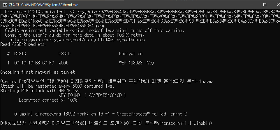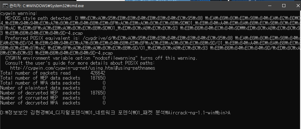 CMD창에 출력된 내용을 간략하게 설명하자면, WEP방식으로 197650 개의 패킷이 암호화 되어있었는데 그것을 복호화했다는 의미한다.