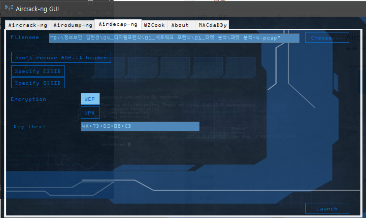 주어진 키 값을 이용해 파일을 복호화 하기 위해 Airdecap -ng 목록으로 들어가 4번 파일을 올린 후, 아까 구한 키값을 넣고 launch버튼