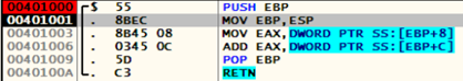 func 함수는 다음과 같이 [EBP+8]안의 6을 EAX에 저장한 후, 이를 [EBP+C]와 더하여 다시 EAX에 저장하는 과정을 수행하고, 이는 func 함수 안의 num1+num2; 코드에 해당된다. 리턴값을 EAX에 저장한 후, func함수는 POP EBP 이후 소멸된다.
