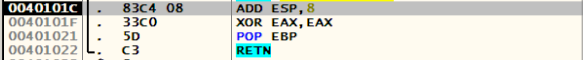 EAX을 0으로 초기화하고 POP EBP를 통해 Main 함수 또한 종료하게 된다 (함수 에필로그).