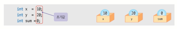 하면 int형 x 를 선언하고, int y에는 0을 대입한것임